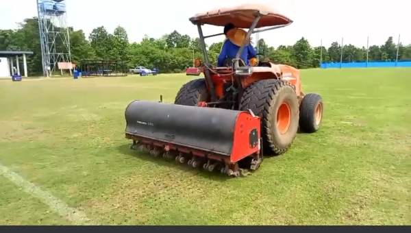 "เจ้าหน้าที่ดูแลสนาม ปรับพื้นหญ้าสนามซ้อม ของสนามบุรีรัมย์ ซิติ้ เพื่อให้นักฟุตบอล ทุกทีมที่เข้าร่วมแข่งขันเอเอฟซี แชมเปี้ยนส์ลีก ได้ซ้อมตามแผน และมีสมาธิกับการฝึกซ้อม การแข่งขัน อย่างเต็มที่