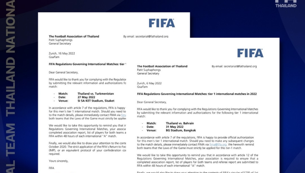สหพันธ์ฟุตบอลนานาชาติ (ฟีฟ่า) ส่งจดหมายยืนยันเกมระหว่าง ทีมชาติไทย พบกับ ทีมชาติเติร์กเมนิสถาน และ ทีมชาติบาห์เรน เป็นการแข่งขันฟุตบอลกระชับมิตรระดับ FIFA International ‘A’ Match