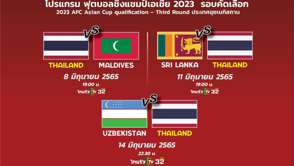 ไทยรัฐ ทีวี ช่อง 32 ยืนยัน เรื่องการถ่ายทอดสดฟุตบอลเอเชียนคัพ 2023 รอบคัดเลือก ทั้ง 3 นัด ซึ่ง ทีมชาติไทยชุดใหญ่ อยู่ในกลุ่มซี ร่วมกับเจ้าภาพ อุซเบกิสถาน, มัลดีฟส์ และ ศรีลังกา