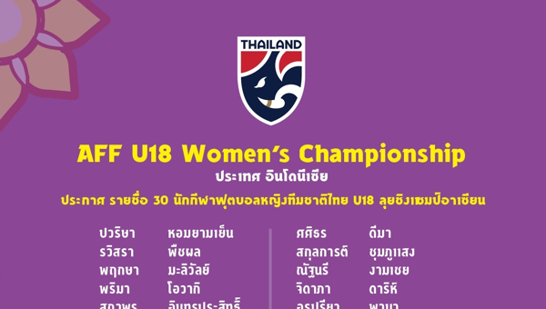 ประกาศ : รายชื่อ 30 นักฟุตบอลหญิงทีมชาติไทย U18 เก็บตัวเตรียม ลุยชิงแชมป์อาเซียน ที่อินโดนีเซีย