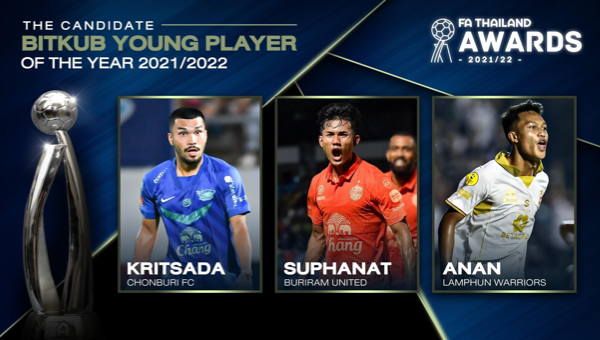 สมาคมกีฬาฟุตบอลแห่งประเทศไทยฯ เผยรายชื่อ 3 นักเตะที่มีชื่อเป็นแคนดิเดต ลุ้นคว้ารางวัล BITKUB YOUNG PLAYER OF THE YEAR 2021/22 ในงานประกาศเกียรติคุณ FA Thailand Awards 2021/22 แก่บุคคลผู้สร้างผลงานดีเด่นในวงการฟุตบอลไทยด้านต่างๆ ประจำปี 2021/22