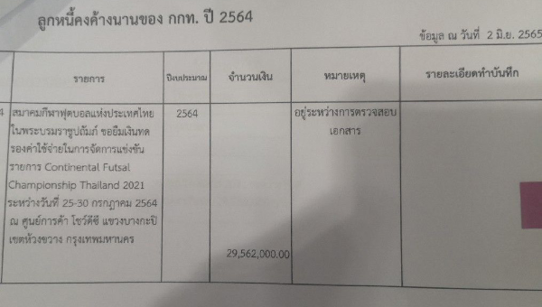 ซึ่งเมื่อวันที่ 9 ธันวาคม 2564 ผู้อำนวยการกองพัฒนากีฬาเป็นเลิศ ปฏิบัติหน้าที่แทนผู้อำนวยการฝ่ายพัฒนากีฬาเป็นเลิศ ได้ตรวจสอบเอกสารในส่วนที่เกี่ยวข้องเรียบร้อยแล้ว และได้ทำหนังสือขอให้ฝ่ายการคลัง ดำเนินการหักล้างเงินยืมทดรองจ่ายให้กับสมาคมกีฬาฟุตบอลแห่งประเทศไทยฯ เป็นเงิน 29,562,000 บาท เป็นที่เรียบร้อยแล้ว