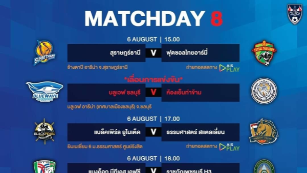 โปรแกรมฟุตซอลไทยลีก2022 แมตซ์เดย์ 8 วันเสาร์ที่ 6 ส.ค.65 มีแข่ง 3 คู่ สุราษฎร์ธานี พบ ฟุตซอลไทยอาร์มี่ ที่ช้างตาปี อารีน่า จ.สุราษฎร์ธานี เวลา 15.00 น. ถ่ายทอดสด AIS PLAY , แบล็คเพิร์ล ยูไนเต็ด พบ ธรรมศาสตร์ สแตลเลี่ยน ที่ยิมเนเซียม 6 ม.ธรรมศาสตร์ ศูนย์รังสิต เวลา 17.00 น. ถ่ายทอดสด AIS PLAY และบันทึกเทปออกอากาศ 23.15 น. , แบงค็อก บีทีเอส พบ ราชภัฏเพชรบุรี3 ที่อาคารเฉลิมพระเกียรติ 72 พรรษา มีนบุรี เวลา 18.00 น. ถ่ายทอดสด AIS PLAY ส่วนวันอาทิตย์ที่ 7 ส.ค.65 มีแข่ง 3 คู่ เกษมบัณฑิต เอฟซี พบ ราชนาวี ที่ยิมเนเซี่ยมชั้น 12 วิทยาเขตร่มเกล้า เวลา 15.00 น. ถ่ายทอดสด AIS PLAY , เอ็นที ฟุตซอลคลับ พบ เชสส์ มหาสารคาม ที่โรงยิมทีโอที แจ้งวัฒนะ เวลา 16.00 น. ถ่ายทอดสด AIS PLAY , การท่าเรือ เอเอสเอ็ม พบ นนทบุรี ที่ โกดัง สเตเดียม เวลา 17.00 น. ถ่ายทอดสด AIS PLAY