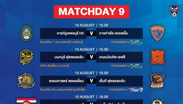 โปรแกรมฟุตซอลไทยลีก2022 แมตซ์เดย์ 9 วันพุธที่ 10 ส.ค.65 แข่งครบ 7 คู่