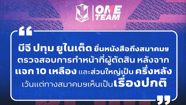 บีจี ปทุม ยูไนเต็ด ยื่นหนังสือถึง สมาคมตรวจสอบการทำหน้าที่ผู้ตัดสิน หลังจาก แจก 10 เหลือง และส่วนใหญ่ เป็นครึ่งหลัง เว้นแต่ทางสมาคมฯเห็นเป็นเรื่องปกติ