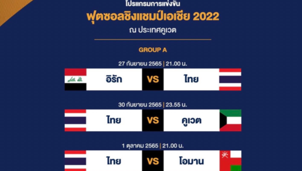 สำหรับฟุตซอลชิงแชมป์​เอเชีย​ “AFC​ Futsal​ Asian​ Cup​2022​“ ทีมชาติไทย อยู่ในสายเอ วันที่​ 27​ กันยายน​ 2565 ไทย พบ อิรัก เวลาไทย 21.00 น., วันที่ 29 กันยายน 2565 ไทย พบ คูเวต เจ้าภาพ 23.55 น. และวันที่ 1 ต.ค.2565 ไทย พบ โอมาน 21.00 น.