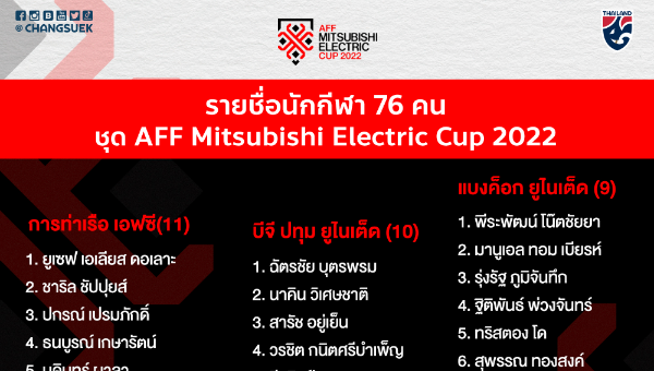 ประกาศรายชื่อ 76 แข้งช้างศึก ชุดทำศึกชิงแชมป์อาเซียน 2022 (AFF Mitsubishi Electric Cup 2022)