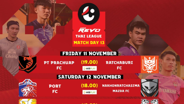 โปรแกรมเชียร์ฟุตบอล REVO THAI LEAGUE 2022/23 ประจำสัปดาห์ที่ 13 มีลงสนาม 6 คู่ หลังบุรีรัมย์ ยูไนเต็ด และบีจี ปทุม ยูไนเต็ด โยกไปเตะกลางสัปดาห์ที่ผ่านมาแล้ว เนื่องจากมีโปรแกรมเตะเจลีก เอเชีย ชาลเลนจ์