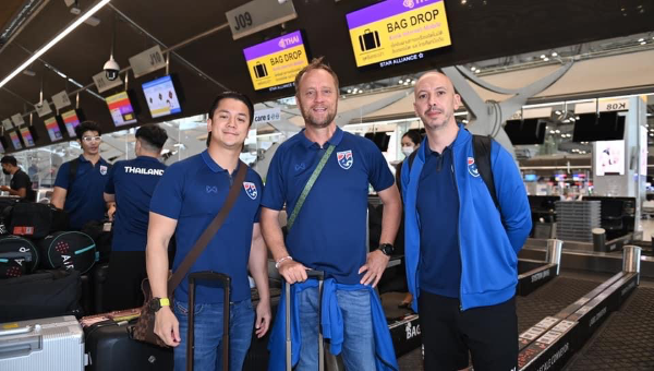 ณ ท่าอากาศยานนานาชาติสุวรรณภูมิ ฟุตบอลชายทีมชาติไทย ชุดใหญ่ รวมตัวกันเพื่อเตรียมออกเดินทางไปลุยศึกชิงแชมป์อาเซียน 2022 รอบรองชนะเลิศนัดแรก ที่จะพบกับ มาเลเซีย