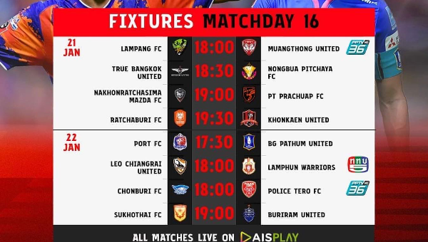 18.00 น. ลำปาง เอฟซี พบ เมืองทอง ยูไนเต็ด สนามกีฬากลางจังหวัดลำปาง ถ่ายทอดสด PPTVHD/ AIS PLAY