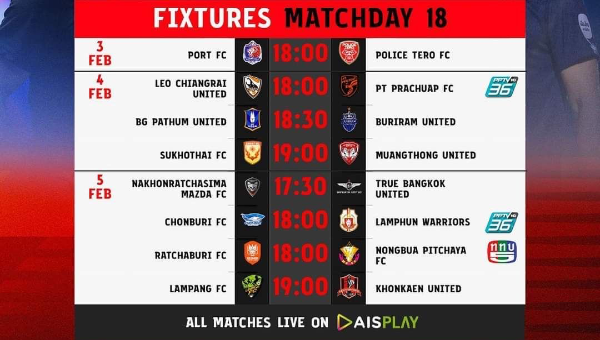 18.00 น. ลีโอ เชียงราย ยูไนเต็ด พบ พีที ประจวบ เอฟซี ที่ ลีโอ เชียงราย สเตเดียม ถ่ายทอดสด PPTVHD/ AIS PLAY