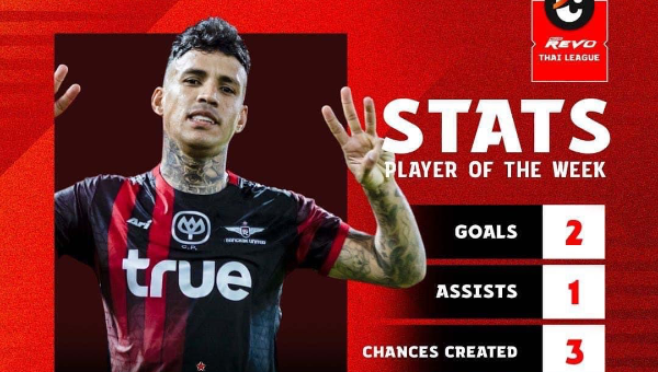 ตัวรุกเลือดบราซิล คว้ารางวัลผู้เล่นยอดเยี่ยมประจำสัปดาห์ที่ 18 หลังทำ 2 ประตู 1 แอสซิสต์ในช่วงเวลาห่างกันแค่ 6 นาที และยังสร้างโอกาสให้เพื่อน เลี้ยงผ่านคู่แข่ง ดวลตัวต่อตัวชนะมากที่สุด ในเกมที่พาแข้งเทพบุกชนะนครราชสีมา มาสด้า 4-0
