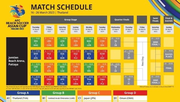โปรแกรมแข่งขันของทีมฟุตบอลชายหาดทีมชาติไทย ในศึก AFC Beach Soccer Asian Cup 2023 ที่หาดจอมเทียน พัทยา สายเอ นัดแรก วันพฤหัสบดีที่ 16 มี.ค.66 ไทย พบ ซาอุดิอาระเบีย เวลา 20.00 น. , นัดสอง วันเสาร์ที่ 18 มี.ค.66 อัฟกานิสถาน พบ ไทย เวลา 20.00 น. และนัดสาม วันอาทิตย์ที่ 20 มี.ค.66 ไทย พบ บาห์เรน เวลา 20.00 น. โดยการแข่งขันรอบแบ่งกลุ่มจะเริ่มระหว่าง 16-21 มี.ค.66 แข่งขันวันละ 4 คู่ คู่แรก 15.30 น. , คู่สอง 17.00 น. , คู่สาม 18.30 น. และคู่สี่ 20.00 น. โดยรายการนี้จะคัด 2 ทีมคู่ชิงไปแข่งขันฟุตบอลชายหาดชิงแชมป์โลกรอบสุดท้ายปี2023ที่ยูเออี "FIFA Beach Soccer World Cup 2023" ในช่วงปลายปีนี้