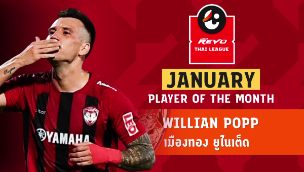 ขณะที่รางวัลผู้เล่นยอดเยี่ยม Revo Thai League player of the Month ประจำเดือนมกราคม ได้แก่วิลเลี่ยม พ็อพพ์ ศูนย์หน้าชาวบราซิล ที่กลับมาค้าแข้งกับทัพกิเลนผยอง ในคำรบที่สอง โดยกลับมาสร้างสรรค์ผลงานการยิง 3 ประตู จากการลงเล่น 2 นัด โดยซัลโวคนเดียวสองประตูในเกมหลังจากเบรคโปรแกรมทีมชาติ และยังมีส่วนร่วมต่าง ๆ กับทัพกิเลนผยอง