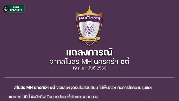 สโมสร MH นครศรีฯ ซิตี้ ขอแสดงจุดยืนไม่สนับสนุน ไม่เห็นด้วย กับการใช้ความรุนแรง และการไม่มีน้ำใจนักกีฬาในทุกรูปแบบทั้งในและนอกสนาม
