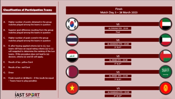*นัดชิงชนะเลิศอันดับ 3 ทีมชาติไทย พบ คูเวต ที่ อัล การาฟา สเตเดียม เวลา 23.00 น. ตามเวลาท้องถิ่น หรือ 03.00 น. ตามเวลาประเทศไทย ถ่ายทอดสดทาง AIS Play*