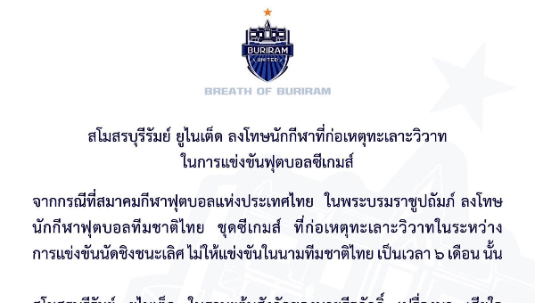 สโมสรบุรีรัมย์ ยูไนเต็ด ลงโทษนักกีฬาที่ก่อเหตุทะเลาะวิวาทในการแข่งขันฟุตบอลซีเกมส์