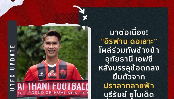 สโมสรอุทัยธานี เอฟซี ประกาศเสริมตัว "อิรฟาน ดอเลาะ" ดีกรีกัปตันทีมชาติ U-23 ที่จะเข้ามาเสริมแกร่งแดนกลางให้กับทีมในฤดูกาล 2023/24 นี้ หลังบรรลุข้อตกลงยืมตัวจากทางปราสาทสายฟ้า "บุรีรัมย์ ยูไนเต็ด" เป็นที่เรียบร้อย