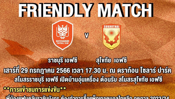 วันเสาร์ที่ 29 กรกฎาคม 2566 เวลา 17.30 น."ราชันมังกร" ราชบุรี เอฟซี เปิดบ้านอุ่นเครื่อง ต้อนรับ สโมสรสุโขทัย เอฟซี
