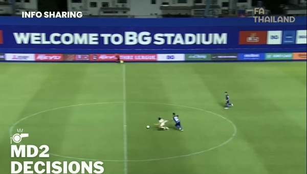 - ซึ่งเมื่อ VAR ได้ตรวจสอบเหตุการณ์ดังกล่าวแล้ว ได้พบว่า จากจังหวะที่ อภิชาติ เด็นหมาน ผู้เล่น พีที ประจวบ เอฟซี ถูกดึงเสื้อนั้น มีโอกาสหลุดเดี่ยวเข้าไปทำประตูได้ เนื่องจากผู้เล่นได้ครอบครองบอลได้อย่างสมบูรณ์แบบ ทิศทางของลูกบอลมุ่งตรงเข้าหาเขตโทษของฝ่ายตรงข้าม และถึงแม้ระยะทางจากเขตโทษของฝ่ายตรงข้ามยังค่อนข้างไกล จังหวะที่มีการทำฟาวล์เกิดขึ้น ไรฮาน สจ๊วร์ต ผู้เล่นของบีจี ปทุม ยูไนเต็ด อีกคนอยู่ไกลจากเหตุการณ์ ทำให้โอกาสที่จะเข้ามาป้องกันเป็นไปได้ยาก VAR จึงได้แนะนำให้ผู้ตัดสินมาตรวจสอบเหตุการณ์จากจอ VAR อีกครั้ง (On-Field Review) ว่าควรลงโทษเป็นใบแดงโดยตรงหรือไม่ เนื่องจากเหตุการณ์นี้ต้องใช้ดุลยพินิจในการพิจารณา