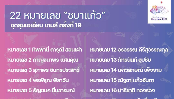 ประกาศ 22 หมายเลข แข้งชบาแก้ว ชุดลุยศึกฟุตบอลหญิง ในมหกรรมกีฬาเอเชียน เกมส์ ครั้งที่ 19 ณ เมืองหางโจว สาธารณรัฐประชาชนจีน