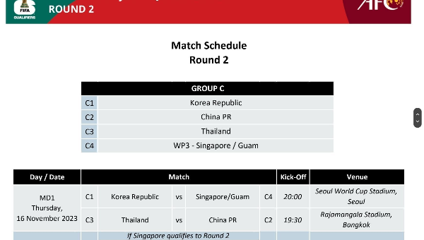 โดยในโปรแกรมแมตช์เดย์ ที่ 2 ของรอบคัดเลือก​ จะแข่งขันในวัน 21 พฤศจิกายน 2566 นั้น ทางเอเอฟซี ได้ส่งจดหมายแจ้งกำหนดการมาดังนี้