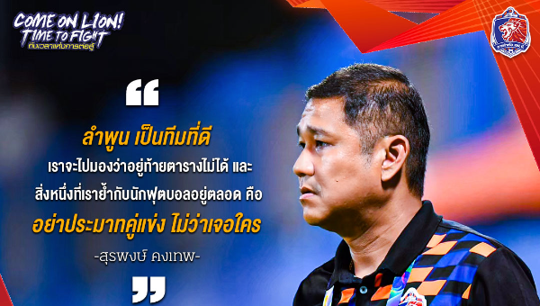 “ลำพูน เป็นทีมที่ดีครับ เราจะไปมองว่าอยู่ท้ายตาราง หรือ มีผลงานไม่ดี ไม่ได้ และ สิ่งหนึ่งที่เราย้ำกับนักฟุตบอลอยู่ตลอด คือ อย่าประมาทคู่แข่งไม่ว่าเจอใคร แต่ด้วยความพร้อม และ โอกาสเล่นในบ้าน ก็เชื่อว่าเราจะเก็บ 3 แต้มได้ครับ”