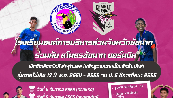 โรงเรียนองค์การบริหารส่วนจังหวัดชัยนาท ร่วมกับ สโมสรชัยนาท ฮอร์นบิล เปิดคัดเลือกนักกีฬาฟุตบอล หลักสูตรด้านความเป็นเลิศด้านกีฬา ประจำปี 2567 ในรุ่นอายุไม่เกิน 13 ปี (เกิดปี พ.ศ.54-55) เข้าเรียนในหลักสูตรฯในชั้นมัธยมศึกษาปีที่ 1 ประจำปี 2567