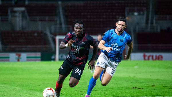 นาทีที่ 17 บาสเซล จราดี้ หมุนหลบผู้เล่น สมุทรปราการ แบบสุดสวย ก่อนที่จะลองยิงไกล บอลหลุดเสาแรกออกไป