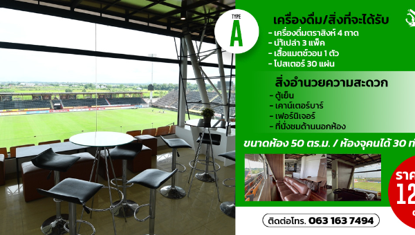 BOX VVIP ห้องชมการแข่งขันสนาม สิงห์ เชียงราย สเตเดียม กับบรรยากาศวิวธรรมชาติสุดสวยที่สามารถมองเห็นภูเขาล้อมรอบ พร้อมสิ่งอำนวยความสะดวกภายในห้อง และสิทธิพิเศษ