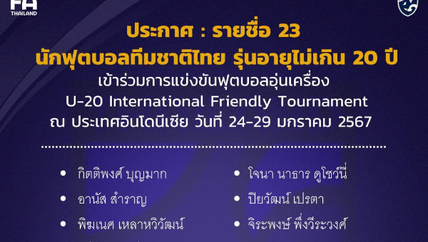 สมาคมกีฬาฟุตบอลแห่งประเทศไทย ในพระบรมราชูปถัมภ์ ตอบรับส่ง ทีมชาติไทย รุ่นอายุไม่เกิน 20 ปี ภายใต้การนำของ ยูกิ ริชาร์ด สตาล์ฟ หัวหน้าผู้ฝึกสอน เข้าร่วมการแข่งขันฟุตบอลอุ่นเครื่อง U-20 International Friendly Tournament ณ กรุงจาการ์ตา ประเทศอินโดนีเซีย เพื่อทำการแข่งขัน 2 นัด ระหว่างวันที่ 24 ถึง 29 มกราคม 2567