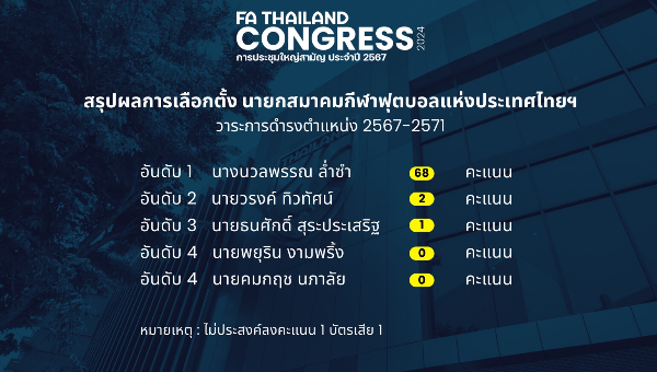 สรุปผลการเลือกตั้ง นายกสมาคมฯ, อุปนายกฯ และ กรรมการกลาง ของสมาคมกีฬาฟุตบอลแห่งประเทศไทยฯ วาระการดำรงตำแหน่ง 2567-2571