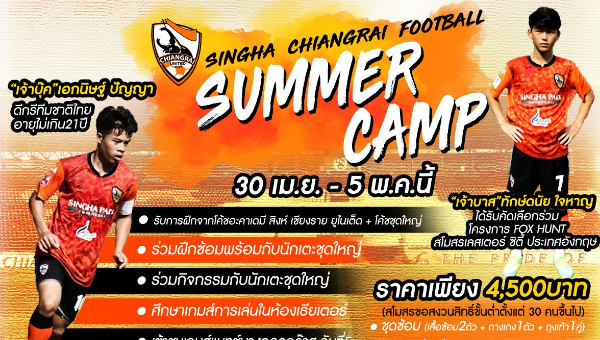 "SINGHA CHIANGRAI FOOTBALL SUMMER CAMP" ร่วมฝึกทักษะแบบมืออาชีพกับแคมป์เก็บตัวที่สโมสรสิงห์เชียงรายยูไนเต็ด ตลอด 6 วันเต็ม ให้กับเยาวชนอายุระหว่าง 8 - 12 ปี ในราคาเพียง 4,500 บาท เปิดรับสมัครแล้วตั้งแต่วันนี้เป็นต้นไป