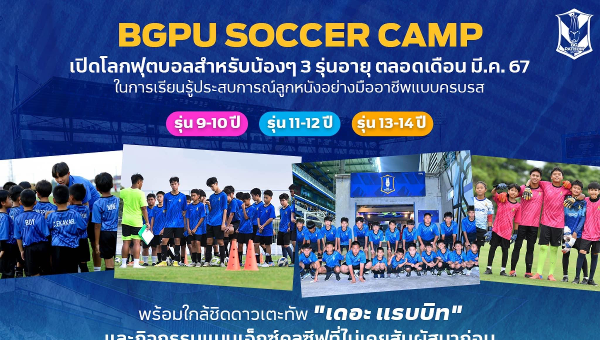 "BGPU SOCCER CAMP" เปิดโลกฟุตบอลสำหรับน้องๆ 3 รุ่นอายุ ตลอดเดือน มี.ค. 67 ในการเรียนรู้ประสบการณ์ลูกหนังอย่างมืออาชีพแบบครบรส พร้อมใกล้ชิดดาวเตะทัพ "เดอะ แรบบิท" และกิจกรรมแบบเอ็กซ์คลูซีฟที่ไม่เคยสัมผัสมาก่อน