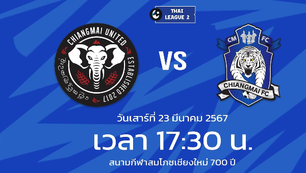 เพื่อเป็นกระตุ้น และส่งเสริมการกีฬาของเชียงใหม่ให้มีความคึกคัก แมตช์การแข่งขันระหว่างเชียงใหม่ ยูไนเต็ด พบ เชียงใหม่ เอฟซี ในวันเสาร์ที่ 23 มีนาคม พ.ศ.2567 เวลา 17.30 น. ณ สนามกีฬาสมโภชเชียงใหม่ 700 ปี เปิดให้เข้าชมฟรีทั้งสนามครับ