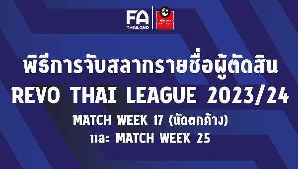 ฝ่ายพัฒนาผู้ตัดสิน สมาคมกีฬาฟุตบอลแห่งประเทศไทย ในพระบรมราชูปถัมภ์ ประกาศรายชื่อผู้ตัดสินที่จะปฏิบัติหน้าที่ในการแข่งขันฟุตบอล รีโว่ ไทยลีก ฤดูกาล 2023/24 แมตช์เดย์ที่ 17 (นัดตกค้าง) และ แมตช์เดย์ที่ 25 หลังการจับสลากผู้ตัดสินสุ่มแบบ Random เพื่อความโปร่งใส และ เห็นพร้อมกันทั่วประเทศ ผ่านการถ่ายทอดสดบนแฟนเพจ ไทยลีก และ FA THAILAND เสร็จสิ้นเป็นที่เรียบร้อยแล้ว