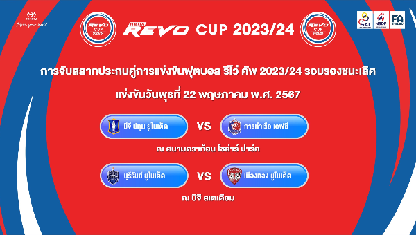 วันพฤหัสบดีที่ 2 พฤษภาคม พ.ศ.2567 เวลา 14.00 น. สมาคมกีฬาฟุตบอลแห่งประเทศไทยฯ ,บริษัท ไทยลีก จำกัด ร่วมกับ บริษัท โตโยต้า มอเตอร์ (ประเทศไทย) จำกัด จัดงานแถลงข่าว และพิธีการจับสลากประกบคู่ รีโว่ คัพ 2023/24 รอบรองชนะเลิศ ณ อาคารเฉลิมพระเกียรติ การกีฬาแห่งประเทศไทย ชั้น 24