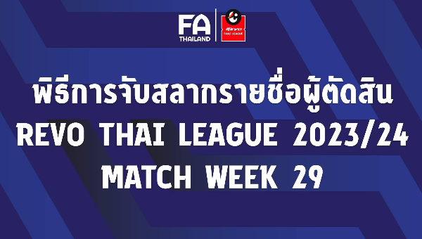ฝ่ายพัฒนาผู้ตัดสิน สมาคมกีฬาฟุตบอลแห่งประเทศไทย ในพระบรมราชูปถัมภ์ ประกาศรายชื่อผู้ตัดสินที่จะปฏิบัติหน้าที่ในการแข่งขันฟุตบอล รีโว่ ไทยลีก ฤดูกาล 2023/24 แมตช์เดย์ที่ 29 โดยได้รับเกียรติจาก พลตำรวจตรี วรวิทย์ ญาณจินดา รองประธานคณะกรรมการฝ่ายผู้ตัดสิน ในการจับสลากในครั้งนี้ หลังการจับสลากผู้ตัดสินสุ่มแบบ Random เพื่อความโปร่งใส และ เห็นพร้อมกันทั่วประเทศ ผ่านการถ่ายทอดสดบนแฟนเพจ ไทยลีก และ FA THAILAND เสร็จสิ้นเป็นที่เรียบร้อยแล้ว