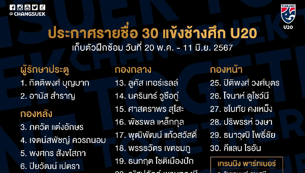 ทีมชาติไทย รุ่นอายุไม่เกิน 20 ปี คุมทีมโดย ยูกิ ริชาร์ด สตาร์ฟ เผยรายชื่อ 30 นักเตะ และอีก 10 คน ที่จะมาซ้อมร่วมกันในระหว่างวันที่ 20 พ.ค. – 11 มิ.ย. 67 ณ แคมป์บุรีรัมย์ ยูไนเต็ด จังหวัดบุรีรัมย์ โดยเป็นการเตรียมความพร้อมก่อนการแข่งขันฟุตบอลชิงแชมป์อาเซียน รุ่นอายุไม่เกิน 19 ปี 2024 ที่จะแข่งขันระหว่างวันที่ 17-31 กรกฎาคม 2567 ที่ประเทศอินโดนีเซีย