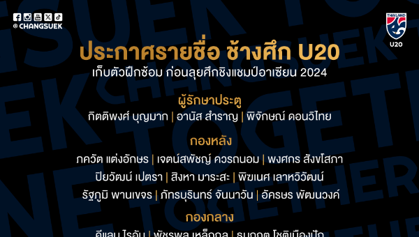 ประกาศรายชื่อรักฟุตบอลทีมชาติไทย รุ่นอายุไม่เกิน 20 ปี เข้าเก็บตัวฝึกซ้อมระหว่างวันที่ 22 มิถุนายน - 16 กรกฎาคม 2567 ณ แคมป์บุรีรัมย์ ยูไนเต็ด จังหวัดบุรีรัมย์ เพื่อตัดตัวนักกีฬาให้เหลือ 23 คนสุดท้าย ก่อนเตรียมสู้ศึกชิงแชมป์อาเซียน รุ่นอายุไม่เกิน 19 ปี 2024 ระหว่างวันที่ 17 - 31 กรกฎาคม 2567 ณ ประเทศอินโดนีเซีย