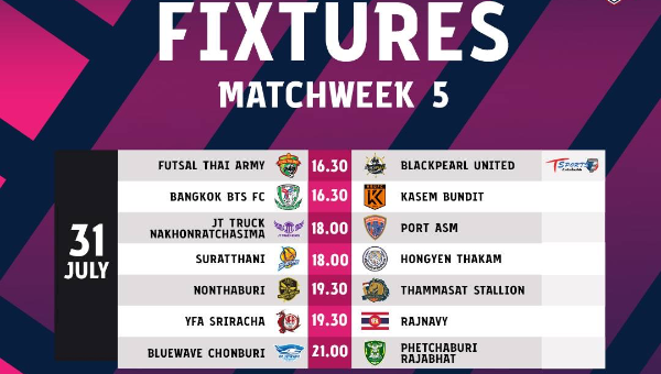 โปรแกรมฟุตซอลไทยลีก 2024-25 นัดที่ 5 แข่งขันวันพุธ 31 ก.ค. 67 ครบทั้ง 7 คู่ 16.30 น. ฟุตซอลไทยอาร์มี่ พบ แบล็คเพิร์ล ยูไนเต็ด ที่อาคารสุรสิงหนาถ กองพล ร.9 จ