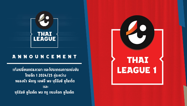 แจ้งเปลี่ยนแปลงเวลา และโปรแกรมการแข่งขัน ไทยลีก 1 2024/25 คู่ระหว่าง หนองบัว พิชญ เอฟซี พบ บุรีรัมย์ ยูไนเต็ด และ บุรีรัมย์ ยูไนเต็ด พบ ทรู แบงค็อก ยูไนเต็ด