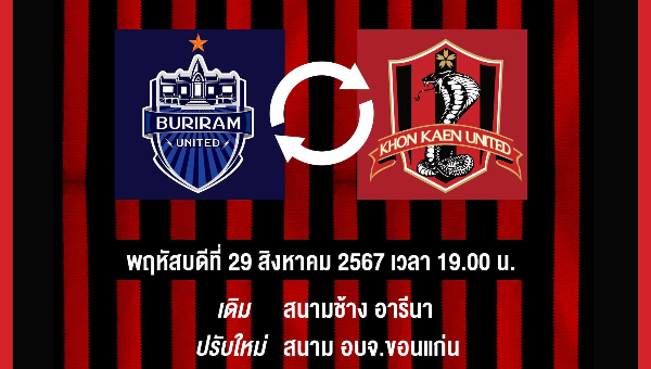แจ้งสลับทีมเหย้า ทีมเยือนการแข่งขันฟุตบอลลีกอาชีพรายการ ไทยลีก 1 2024/25 คู่ระหว่าง บุรีรัมย์ ยูไนเต็ด พบ ขอนแก่น ยูไนเต็ด