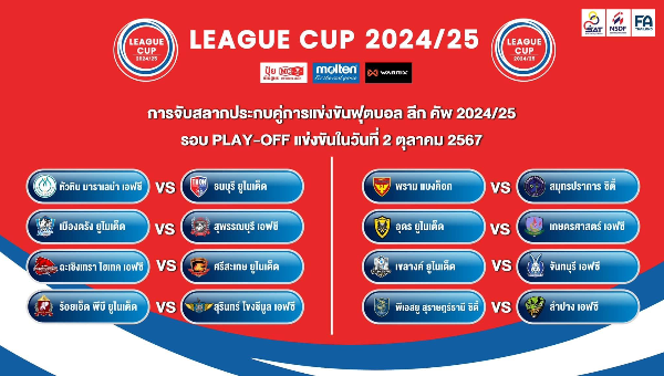 สมาคมกีฬาฟุตบอลแห่งประเทศไทย ในพระบรมราชูปถัมภ์ พร้อมด้วย บริษัท ไทยลีก จำกัด ร่วมกับ บริษัท ไทยเซ็นทรัลเคมี จำกัด(มหาชน) บริษัท มอลเทน (ไทยแลนด์) บริษัท วอริกซ์ สปอร์ต จำกัด (มหาชน) จำกัดผู้สนับสนุนหลัก จัดพิธีจับสลากฟุตบอลถ้วยที่ยิ่งใหญ่ของประเทศไทย รายการ ลีก คัพ 2024-25 รอบเพลย์-ออฟ