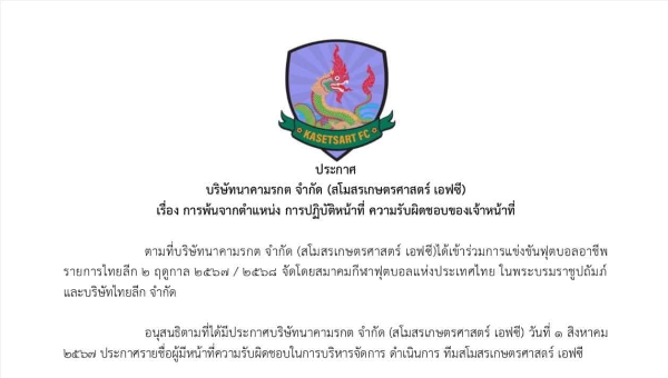 เกษตรศาสตร์ เอฟซี ออกหนังสือแจ้งประกาศปลดผู้บริหาร ตั้งแต่ ประธานสโมสร, รองประธานสโมสร, ประธานที่ปรึกษา และ ผู้จัดการทั่วไปของสโมสร