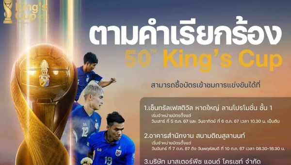สำนักงานประชาสัมพันธ์จังหวัดสงขลา ประกาศแจ้ง จุดจำหน่ายบัตรเข้าชมการแข่งขันฟุตบอลชิงถ้วยพระราชทานคิงส์ คัพ ครั้งที่ 50 ที่จะแข่งขัน ณ สนามกีฬาติณสูลานนท์ ในวันศุกร์ที่ 11 และ วันจันทร์ที่ 14 ตุลาคม 2567