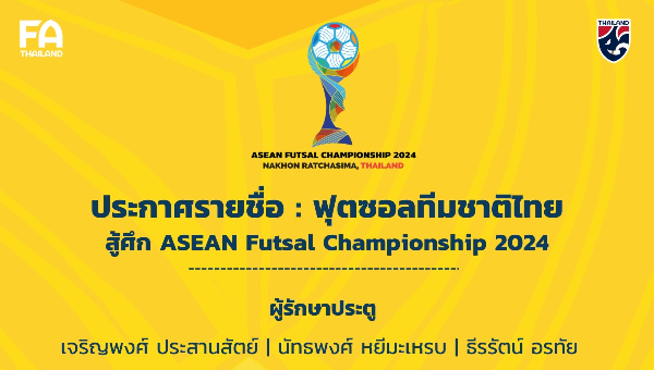 ประกาศ : รายชื่อ 20 แข้งฟุตซอลชายทีมชาติไทย ชุดลุยศึก ASEAN Futsal Championship 2024 ที่ ประเทศไทย