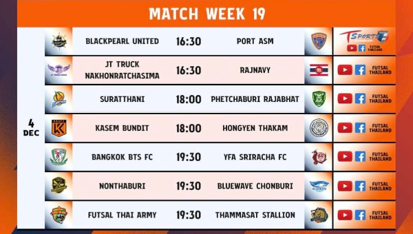 โปรแกรม MEA ฟุตซอลไทยลีก 2024 นัดที่ 19 แข่งขัน 7 คู่ในวันพุธที่ 4 ธ.ค.67 คู่แรก 16.30 น. แบล็คเพิร์ล ยูไนเต็ด พบ การท่าเรือ เอเอสเอ็ม ที่ไอมาเน่ เลิศนิมิต สเตเดียม จ.ประจวบคีรีขันธ์ ( T-Sports7 ) , 16.30 น. เจทีทรัค นครราชสีมา พบ ราชนาวี ที่ อินดอร์สเตเดียม ม.วงษ์ชวลิตกุล จ.นครราชสีมา , 18.00 น. สุราษฎร์ธานี พบ ราชภัฏเพชรบุรี ที่ช้างตาปี อารีน่า จ.สุราษฎร์ธานี , 18.00 น. เกษมบัณฑิต เอฟซี พบ ห้องเย็นท่าข้าม ที่ยิมเนเซี่ยม ชั้น 12 ม.เกษมบัณฑิต วิทยาเขตร่มเกล้า , 19.30 น. แบงค็อก บีทีเอส พบ วายเอฟเอ ศรีราชา ที่อาคารเฉลิมพระเกียรติ 72 พรรษา มีนบุรี , 19.30 น. นนทบุรี พบ บลูเวฟ ชลบุรี ที่ลำโพ สเตเดียม จ.นนทบุรี และ 19.30 น. ฟุตซอลไทยอาร์มี่ พบ ธรรมศาสตร์ สแตลเลี่ยน ที่อาคารสุรสิงหนาถ กองพล.ร.9 จ.กาญจนบุรี