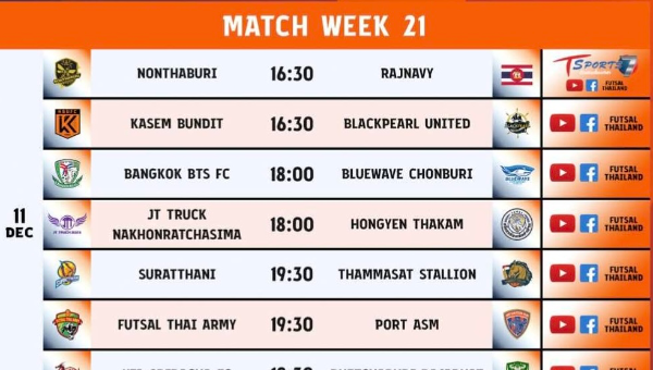 โปรแกรม MEA ฟุตซอลไทยลีก 2024 แมตช์เดย์ 21 แข่งขันวันพุธ 11 ธ.ค. 67 ครบทั้ง 7 คู่ 16.30 น. นนทบุรี พบ ราชนาวี ที่ ลำโพ สเตเดียม จ.นนทบุรี (T-Sports 7), 16.30 น. เกษมบัณฑิต เอฟซี พบ แบล็คเพิร์ล ยูไนเต็ด ที่ยิมเนเซียม ชั้น 12 ม.เกษมบัณฑิต วิทยาเขตร่มเกล้า, 18.00 น. แบงค็อก บีทีเอส พบ บลูเวฟ ชลบุรี ที่ อาคารเฉลิมพระเกียรติ 72 พรรษา มีนบุรี, 18.00 น. เจทีทรัค นครราชสีมา พบ ห้องเย็นท่าข้าม ที่ลิปตพัลลภ ฮอลล์ สนามกีฬาเฉลิมพระเกียรติ 80 พรรษา จ.นครราชสีมา , 19.30 น. สุราษฎร์ธานี พบ ธรรมศาสตร์ สแตลเลี่ยน ที่ช้างตาปี อารีนา จ.สุราษฎร์ธานี, 19.30 น. ฟุตซอลไทยอาร์มี่ พบ การท่าเรือ เอเอสเอ็ม ที่อาคารสุรสิงหนาถ กอง พล.ร.9 จ.กาญจนบุรี และ 19.30 น. วายเอฟเอ ศรีราชา พบ ราชภัฏเพชรบุรี ที่ ยิมเนเซียม โรงเรียนหัวถนนวิทยา จ.ชลบุรี