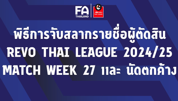 ประกาศ : รายชื่อ "ผู้ตัดสิน" ปฏิบัติหน้าที่ในการแข่งขันฟุตบอล รีโว่ ไทยลีก ฤดูกาล 2024/25 แมตช์เดย์ที่ 27และ แมตช์เดย์ที่ 22 (นัดตกค้าง)